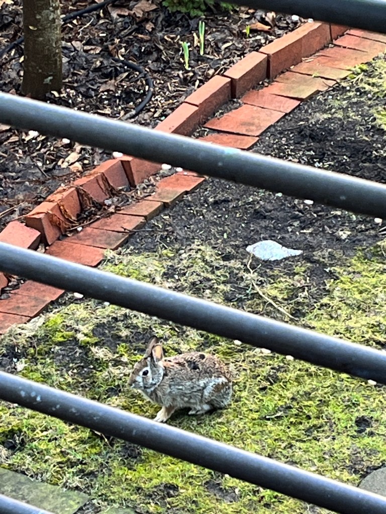 Wild rabbit that hung out with me for about an hour. Very chillDaffodils in full bloom already Columnar apple on the back terrace