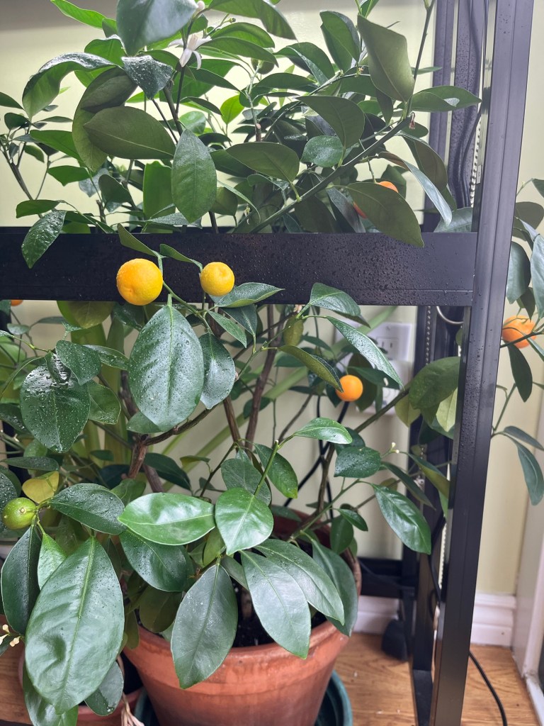 My calamondin citrus always gets infested with scale insects. Today was the alcohol and Q-tip treatment. I try and check the underside of every leaf and stem along the veins for the little armoured creatures, then give them a dab of the alcohol and with the dry tip wipe them off the plant. I am just that crazy. The first sign of infestation is the clear, sticky honeydew they excrete which falls on the upper side of leaves below the creature. She’s worth it!