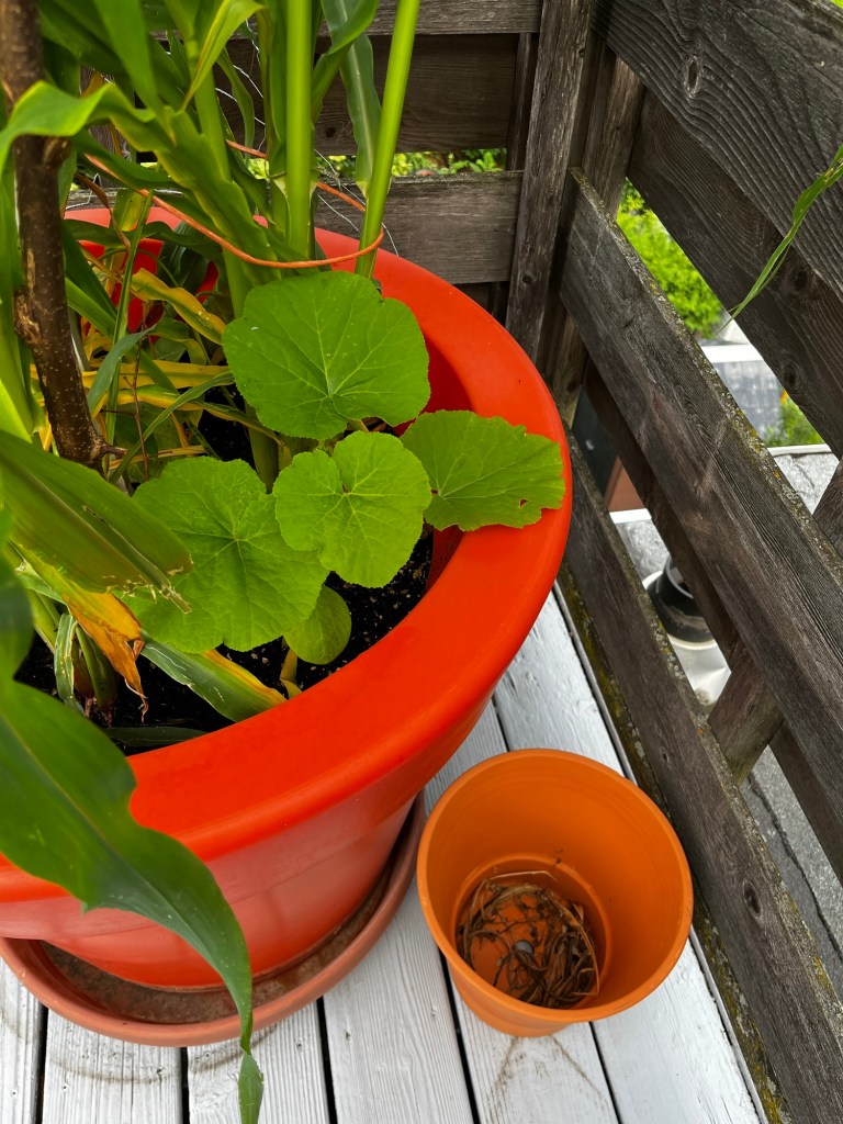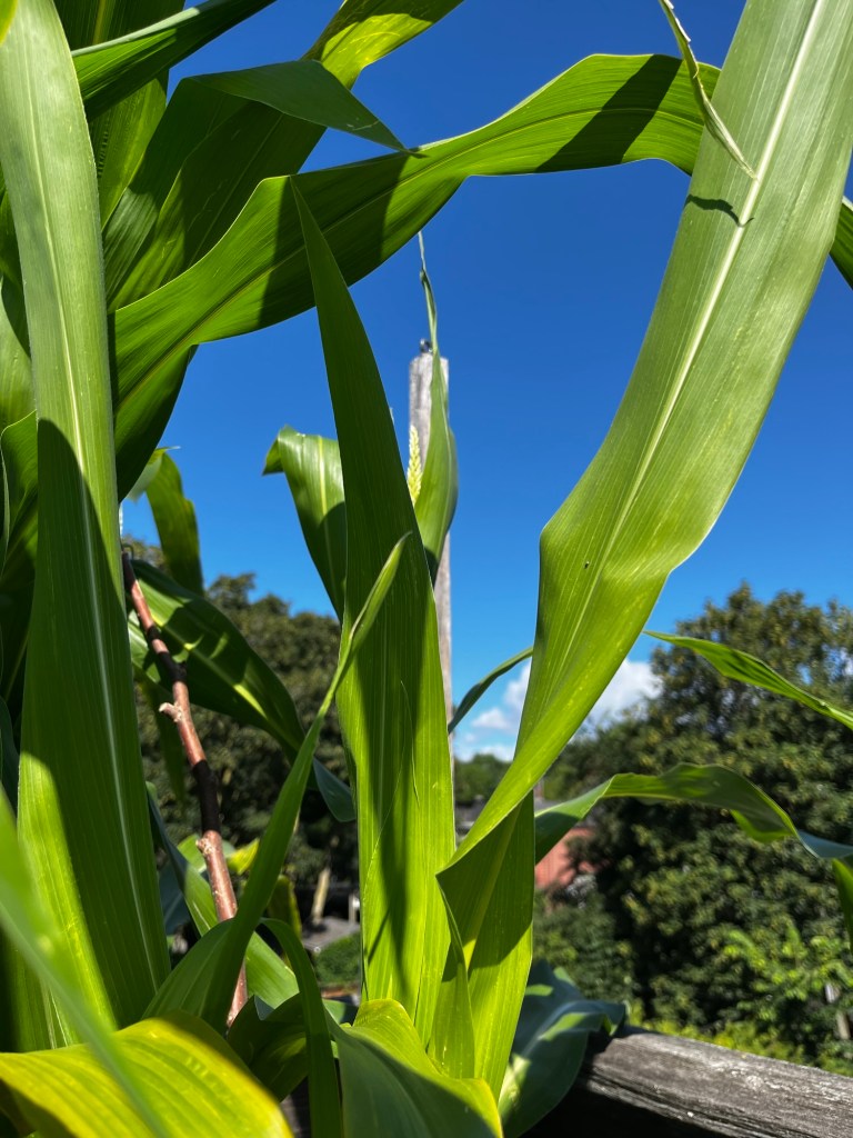 One pot of the three sisters is coming along. Well the corn is. The beans and squash not so much, but they were intentionally planted later.