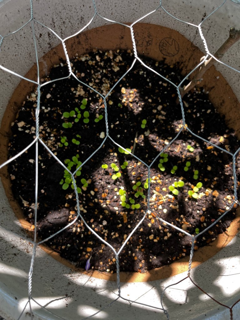 Trying a second crop of greens with sticks for protection.