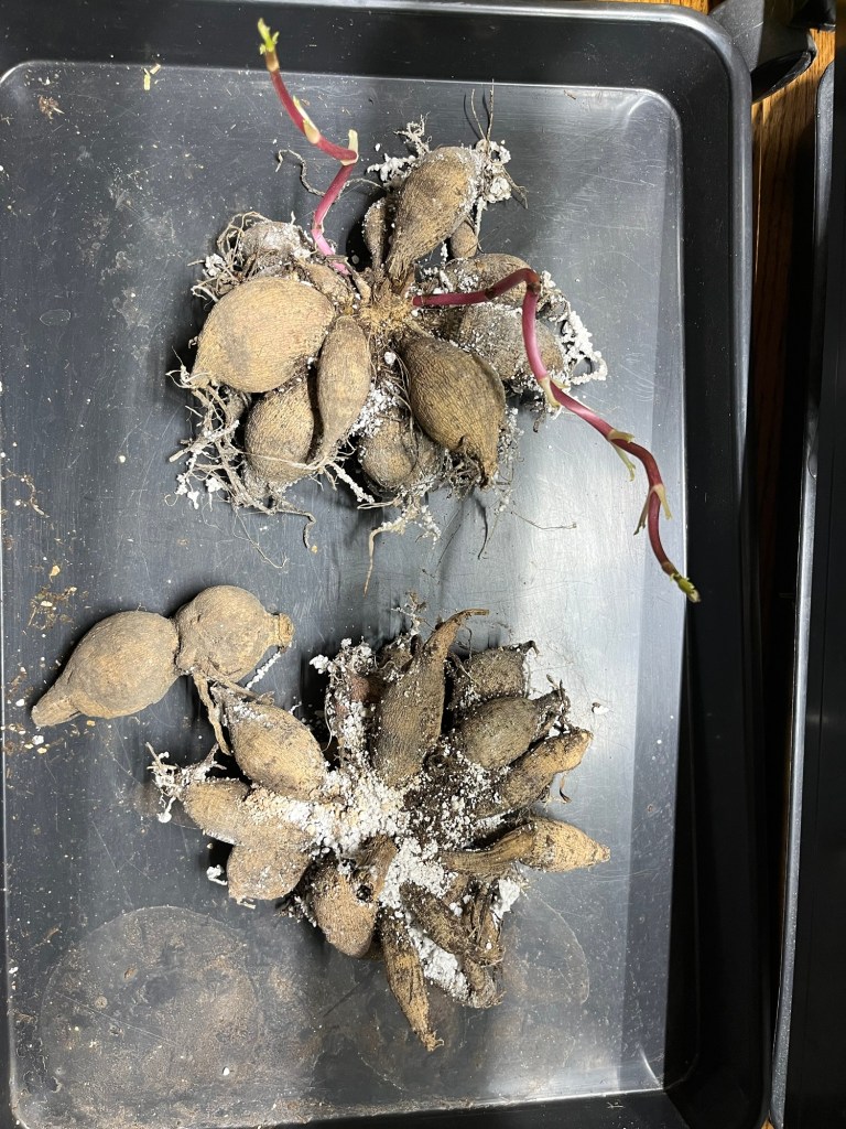 March 28, 2026 by Farmerto Happy signs for tubers Uncategorized dahlias Leave a comment The dahlia tubers have all survived winter in the attic and have started sprouting. What to do given it isn’t April yet. So pot them up. Fingers crossed that I can get them outside in early May. Share this: Share on X (Opens in new window) X Share on Facebook (Opens in new window) Facebook Like Loading...